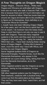 - “Draconian Wicca: Dragon Magick” (March 9, 2013): included as an example of early online dragon-magick framing and overlapping dragon-path terminology in circulation during the formative social-media period.