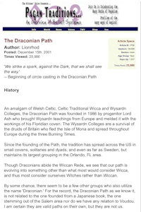 In a 2001 article published on Pagan Traditions / WitchVox, the system is described as “an amalgam of Welsh Celtic, Celtic Traditional Wicca and Wysardn Colleges” and stated that “the Draconian Path was founded in 1986 by progenitor Lord Ash.” In a later 2023 public answer, however, Lady Lionrhod also referenced 1983 as a possible alternative founding date.